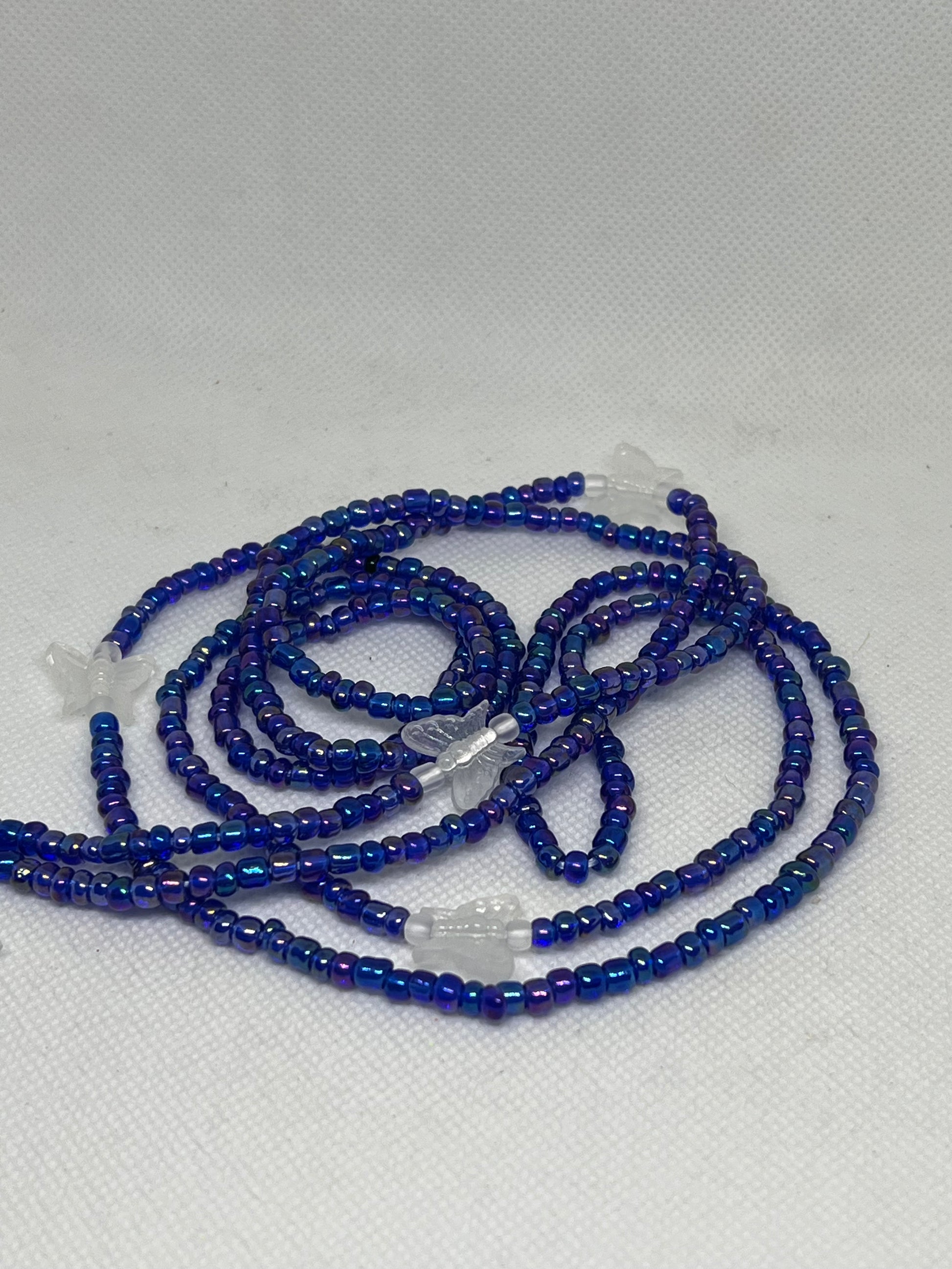 Butterflies glow in the dark. 60 inches long permanent tie on waist beads